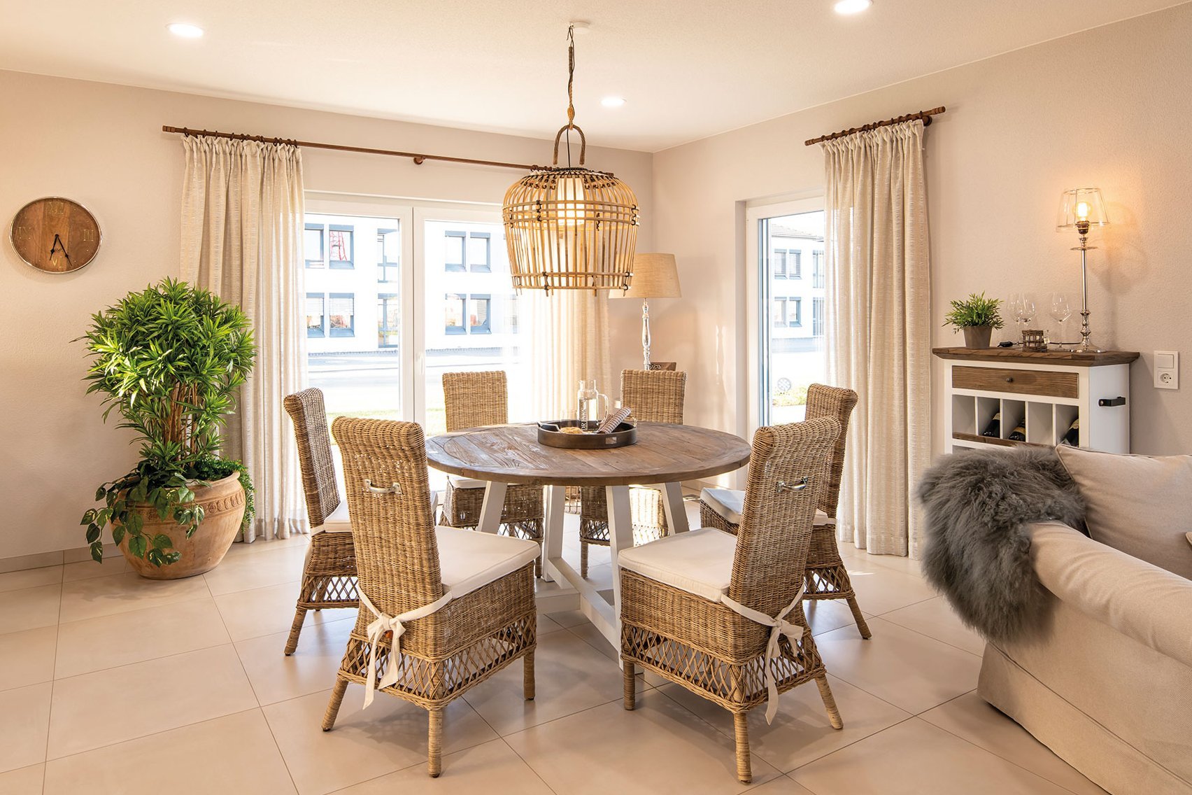 Dorle Finger-Cronau: Die Basis des Stils sind helle Farbtöne. Diese können hervorragend mit einzelnen Kontrastflächen ergänzt werden. Mit farbiger Dekoration, beispielsweise Kerzen, Vasen oder Sitzkissen, kann ein schöner Kontrast zum Hellen gesetzt werden. Hierbei sollten nicht zu viele Farben kombiniert werden, sondern sich lieber wenige Farben wiederholen. Im Wohnzimmer würde ich beispielsweise eine zurückhaltende Farbe des Sofas wählen und einzelne Farbakzente durch Kissen oder Decken, je nach Trend oder Geschmack, einfügen. Im Musterhaus JUNO in Frankenberg habe ich genau das umgesetzt: eine Farbbasis von hellen Naturtönen und -materialien mit einzelnen blauen Highlights.